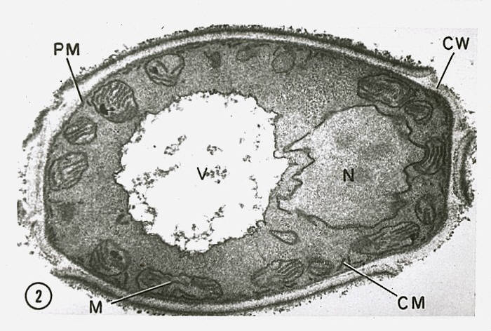 The image on the left shows an electron micrograph of a normal budding form.