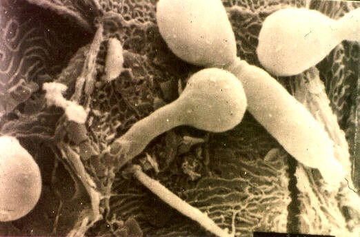 On the left is an image of the Mycelial form or pathogenic form of Candida with Pseudohyphae with chlamydospores (grape-like spores) making up the clusters of blastoconidia.