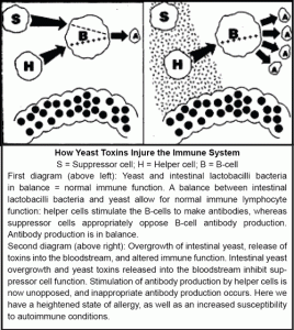 Second diagram: Overgrowth of intestinal yeast, release of toxins into the bloodstream, and altered immune function. Intestinal yeast overgrowth and yeast toxins released into the bloodstream inhibit suppressor cell function. Stimulation of antibody production by helper cells is now unopposed, and inappropriate antibody production occurs. Here we have a heightened state of allergy, as well as an increased susceptibility to autoimmune conditions.